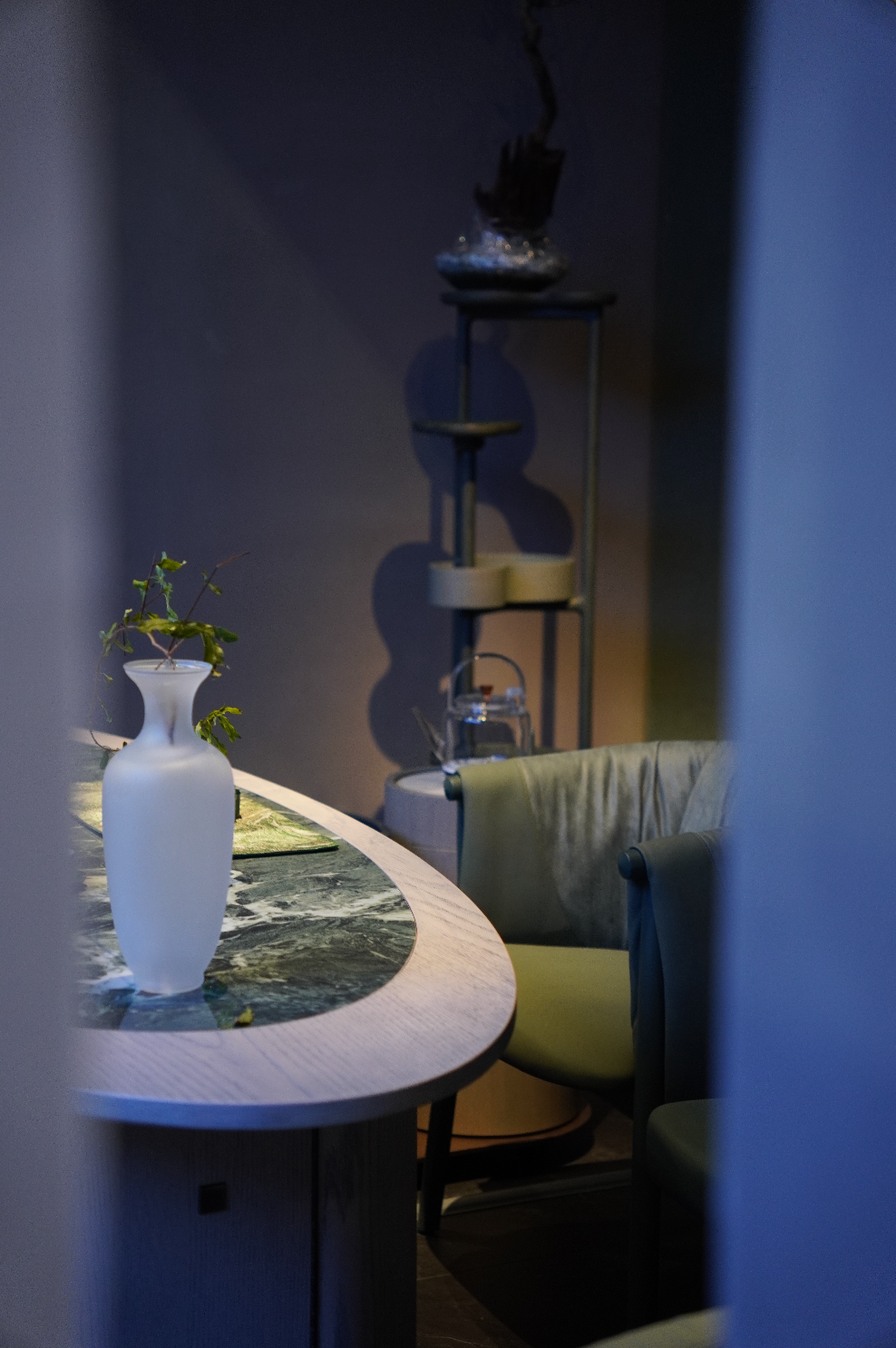 以舟为形,设计上将传统茶桌流线化,让茶桌成为空间中的视觉焦点。桌面底部模拟了小舟的造型,曲面造型勾勒出架空感,使茶桌整体更加轻盈。茶桌在整体造型上呈现左右对称的布局,营造一种视觉的平衡,极具东方对称美学。