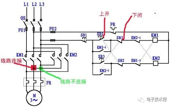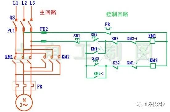 如图1中,左侧红色部分是主回路,右侧绿色部分为控制回路。