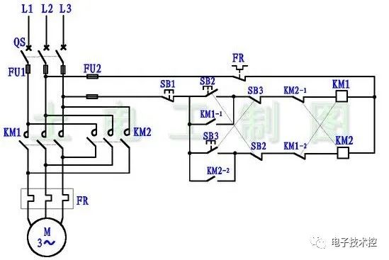 如图2中,比如正转接触器KM1,主回路中主触点标示为KM1,控制回路中此接触器线圈、辅助触点也同样标KM1,当然,一个接触器有若干辅助触点,为了区分明显,可以加上后缀,比如:KM1-1、KM1-2。也可以不加后缀。