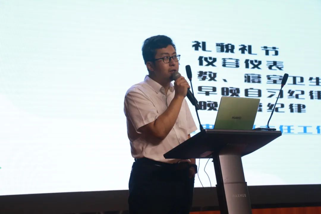 王融针对在校生礼貌礼节、仪容仪表、寝室卫生等在校生要求进行详细讲解,并进行了安全教育。