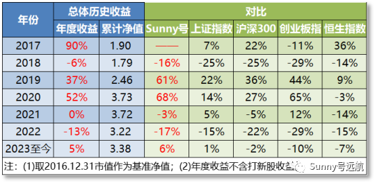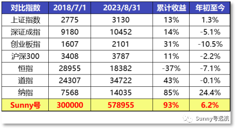最后,记录一下Sunny号的情况。8月无操作。截至2023年8月31日,Sunny号年内收益6.2%。自实盘开通以来(5.17年)累计收益93%复合年化收益14%。实盘记录如下: