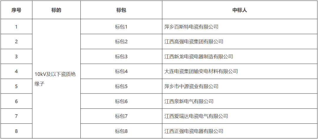 广东电网公司2023年第二批框架招标(10kV及以下瓷质绝缘子)(招标编号:CG0300022001597599)中标结果,现予以公告: