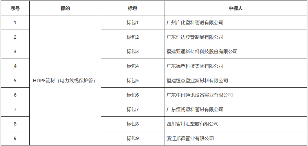 广东电网公司2023年第二批框架招标(HDPE管材(电力线缆保护管))(招标编号:CG0300022001606167)中标结果,现予以公告: