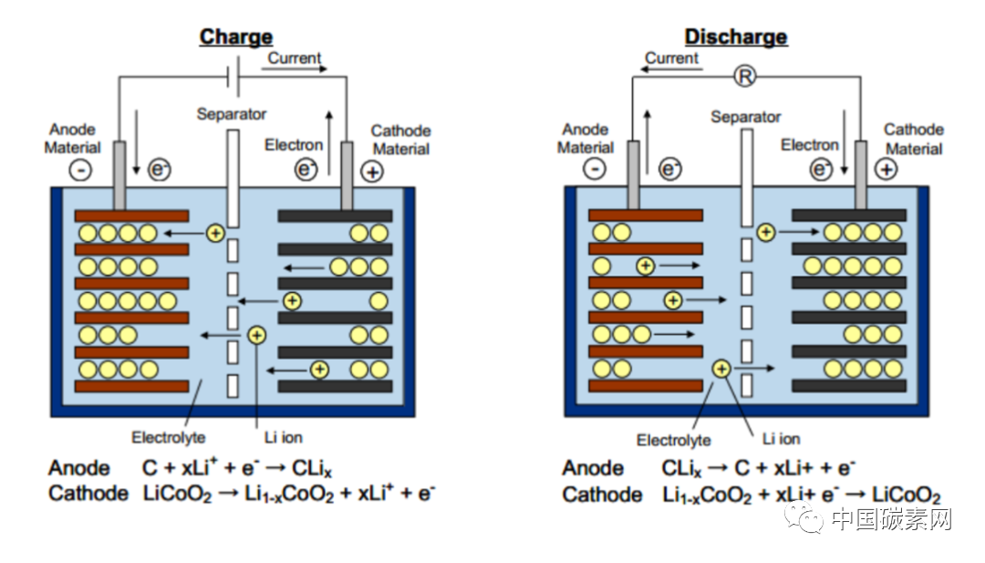 注:Cathode/Anode Material(正极/负极材料);Electrolyte(电解液);Separator(隔膜);Electron(电子);Charge/Discharge(充电/放电);Current(电流);Li ion(锂离子)