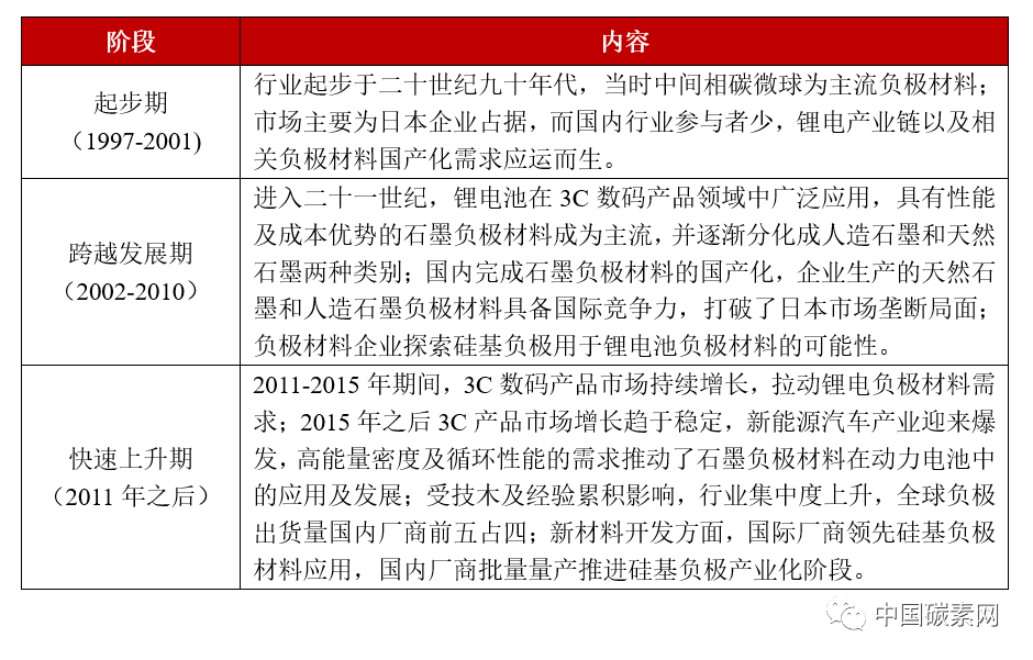 负极材料行业经历了“中间相碳微球材料为主、日企主导市场”的起步期,“石墨材料为主、国内企业崛起”的跨越发展期,到如今的“探索新型负极材料、国内企业主导市场”的快速上升期。