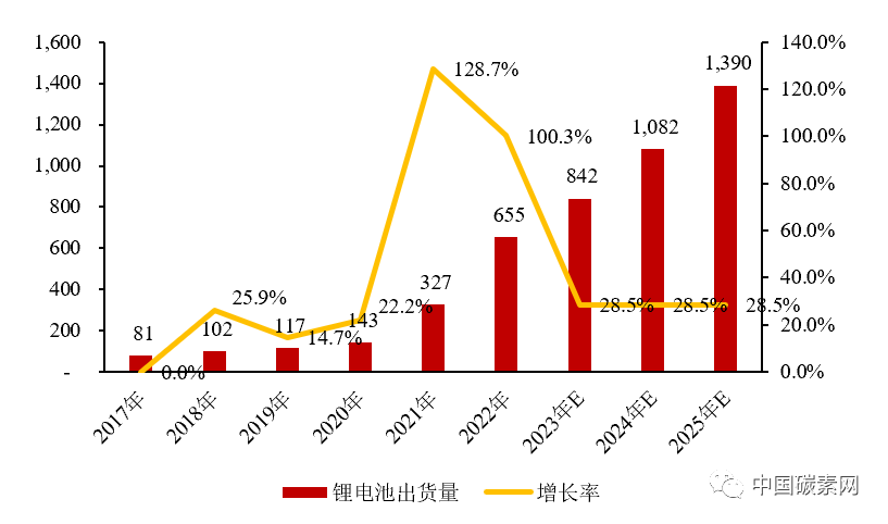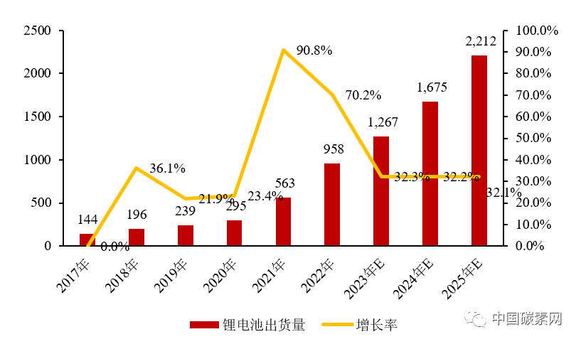 在全球市场,根据EVTank数据,2017年全球锂离子电池出货量144GWh,2022年全球锂离子电池出货量958GWh,2017-2022年复合增长率达到46.1%,并预计2025年出货量将达到2,212GWh,预测期内复合增长率为32.2%。