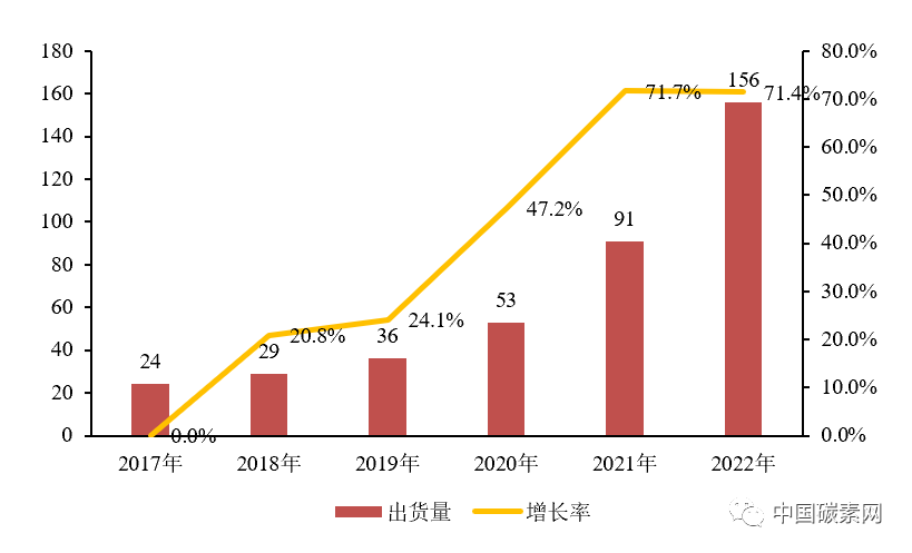 近年来,受益于新能源汽车、通信储能、电力储能、智能穿戴等应用领域的快速发展,锂电池负极材料市场迎来爆发式增长。在全球市场,根据GGII数据,2017年全球锂电池负极材料出货量24万吨,2022年全球锂电池负极材料出货量156万吨,较2021年同比增长71.4%,2017-2022年复合增长率达到45.4%,预计到2025年全球锂电池负极材料需求将超过190万吨。