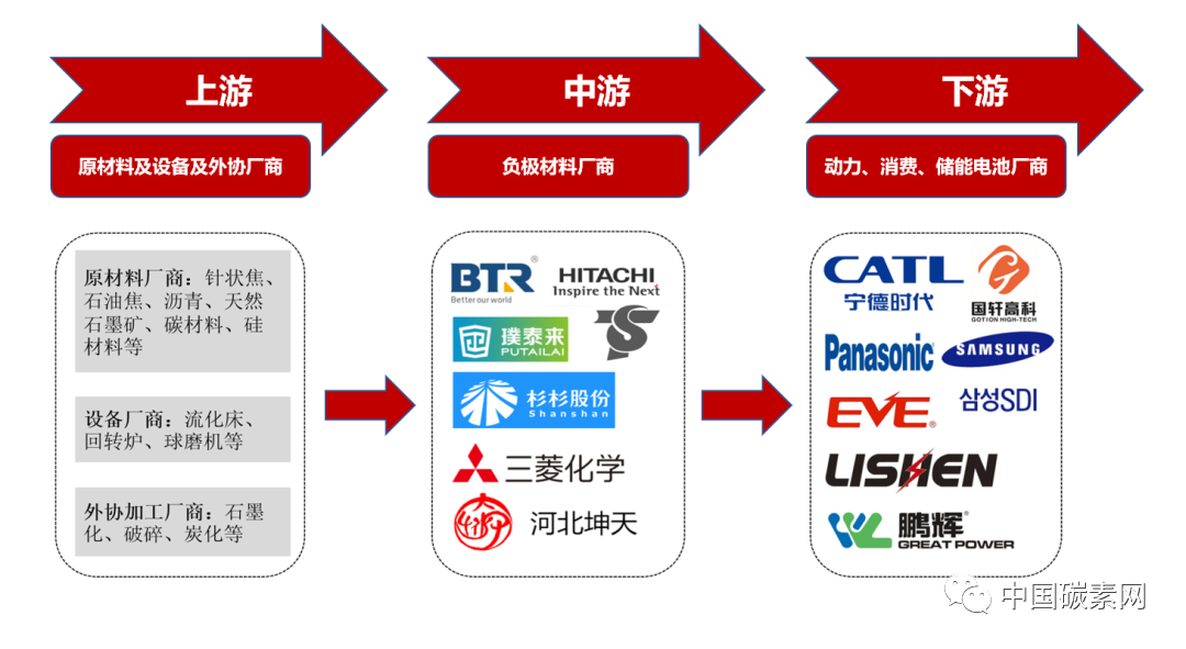 负极材料产业链由上游的原材料及设备供应商以及外协厂商、中游的负极材料厂商、下游锂电池厂商构成。具体来看,上游主要为针状焦、石油焦、沥青、天然石墨矿、碳材料、硅材料等原材料供应商,流化床、回转炉、球磨机等设备供应商,以及石墨化、破碎等外协加工厂商;下游广泛应用于动力电池、消费电池、储能电池领域。
