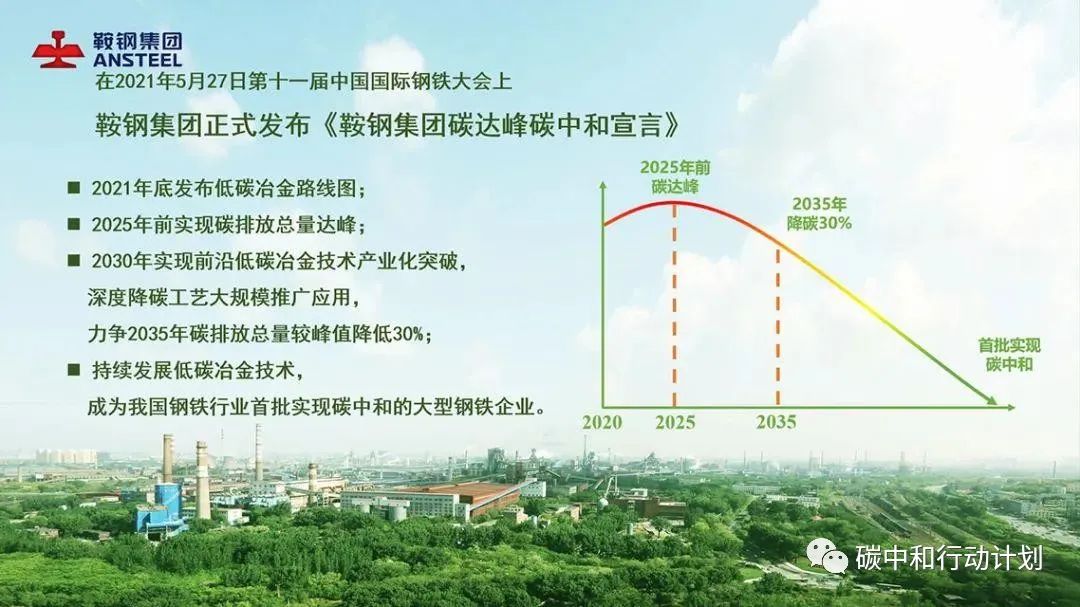鞍钢集团发布《鞍钢集团碳达峰碳中和宣言》,郑重承诺:2021年底发布低碳冶金路线图;2025年前实现碳排放总量达峰;2030年实现前沿低碳冶金技术产业化突破,深度降碳工艺大规模推广应用,力争2035年碳排放总量较峰值降低30%;持续发展低碳冶金技术,成为我国钢铁行业首批实现碳中和的大型钢铁企业。