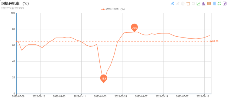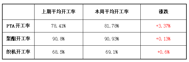 开工率方面,PTA平均开工率在81.78%,较上周上涨3.37%;聚酯方面,聚酯平均负荷为90.93%,较上周上涨0.13%。市场气氛有所好转,秋冬面料订单开始下达,织造开机率有所回升,在69.1%左右。