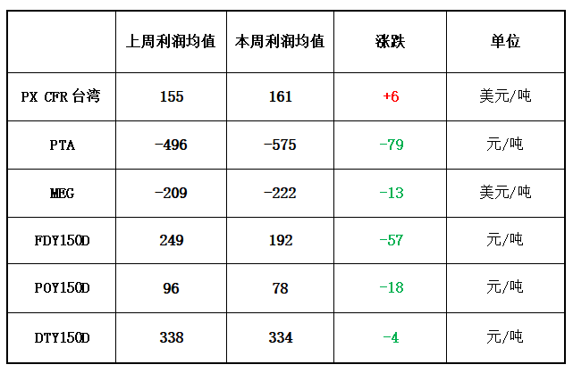 本周PX盈利较上周小幅回升,目前其盈利至161美元/吨。PTA方面,本周亏损增加,目前亏损其至575元/吨附近。乙二醇方面,本周亏损增加,目前亏损222美元/吨。涤纶长丝方面,本周涤丝价格由于成本端跌幅较大,涤丝产品价格整体变化较大,因此利润变化较大,部分规格盈利增减少,FDY150D盈利192元/吨;POY 150D盈利减少,目前盈利78元/吨;DTY 150D盈利减少,目前盈利334元/吨。