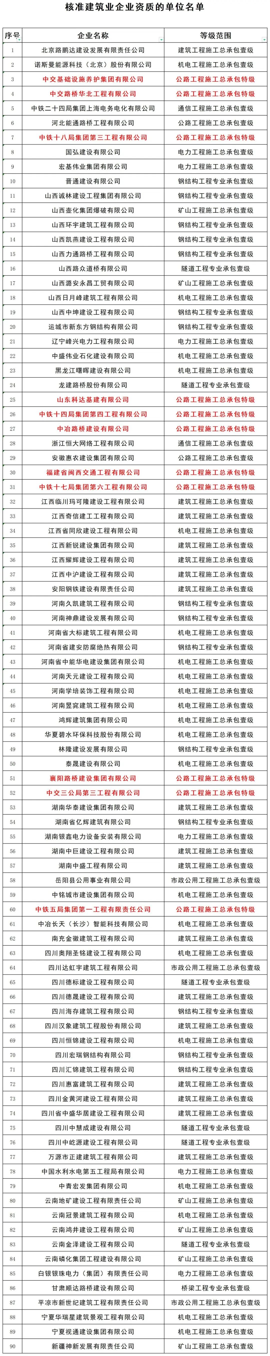 本次90家建筑企业申请90项资质,共计11家建筑企业成功晋升特级,均为公路工程施工总承包特级,详情如下: