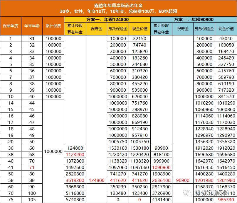 以30岁女性,年交10万,交10年,60周岁开始领取为例