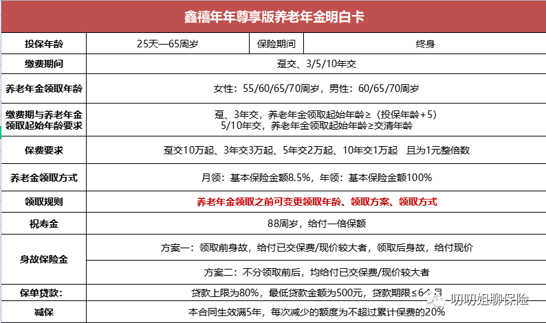 鑫禧年年(尊享版)最高65岁可投,缴费期最长10年,趸交10万起,期交最低1万起,养老金可年领可月领,活多久领多久,年龄达到88岁,还能给付祝寿金 ,现金价值持续至终身,支持附加万能账户