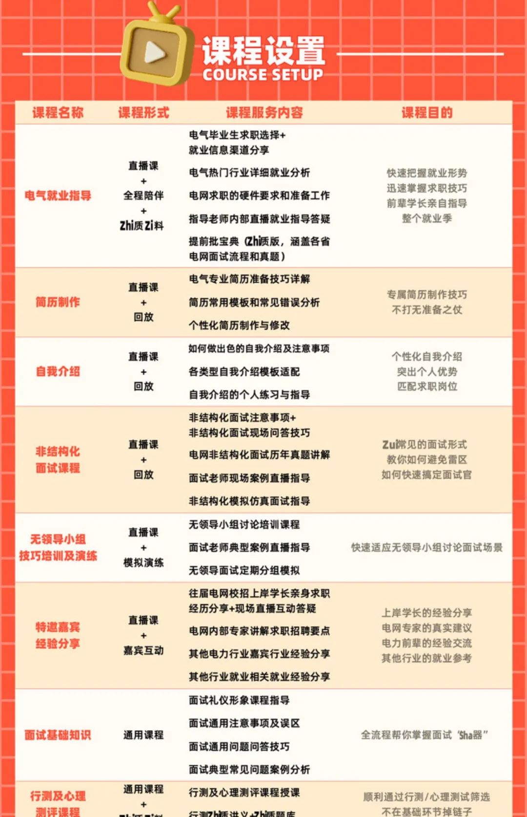 电网内部专家、各大院校入职学长,课程期间会与学员内部交流指导、直播互动答疑。还特邀其他行业优秀嘉宾内部指导就业,帮助毕业生做出全面选择。