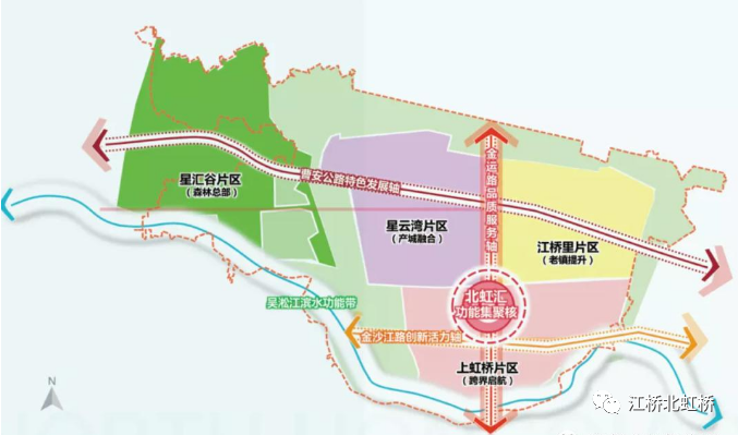 据了解,虹桥国际中央商务区北虹桥片区嘉定江桥地区前不久重磅发布了嘉定江桥北虹桥片区“一核、一带、三轴、四区”布局规划,江桥将全面贯彻落实区委决策部署,围绕“开放北虹桥、创新领航地”目标,进一步优化城市发展规划,聚焦产业转型升级,探索精细化社会治理,提升城市综合品质,着力打造协同创新的引领核心、近悦远来的活力都市、公园城市的融合典范。加快形成“一核聚能、一带润城、三轴联动、四区共荣”的空间布局。“一核”即北虹汇,位于五四村城中村开发区域,集聚优势资源打造北虹桥核心,提升地区形象,为大型功能性项目和城市大事件提供落地空间;“一带”即吴淞江生态功能带,建设虹桥中央公园先行示范区,串联滨水特色产业节点;“三轴”即金运路品质服务轴、曹安公路特色发展轴、金沙江路创新活力轴,结合轨交站点、绿色空间、产业基础、人文环境、居住规模等要素,形成更加清晰的发展导向和功能定位;“四区”即上虹桥片区、星云湾片区、江桥里片区、星汇谷片区,分别承担了跨界起航、产城融合、老镇提升、森林总部四大功能,城市设计上更加注重创新突破,打造符合虹桥国际开放枢纽定位的城市形象。(如图):