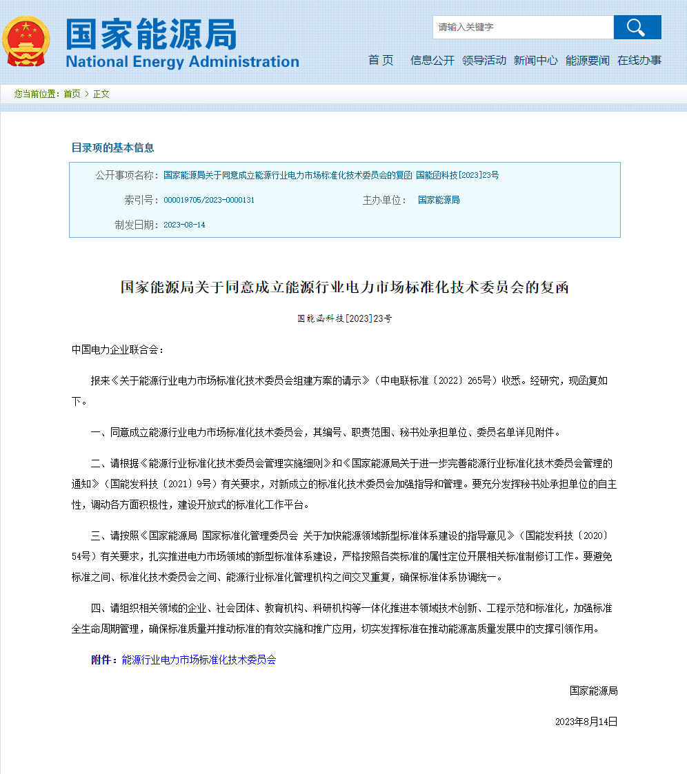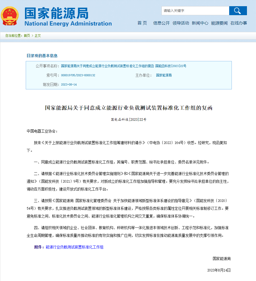 近日,国家能源局网站发布两个复函,同意成立能源行业负载测试装置标准化工作组、能源行业电力市场标准化技术委员会。
