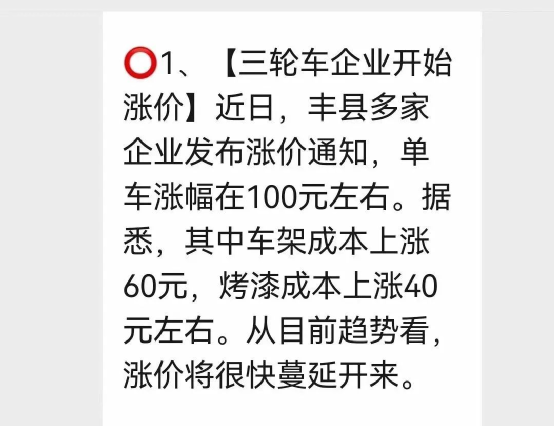 最近的三轮车市场热闹不已,企业一边忙着冲刺旺季,一边又被迫迎来了新一轮涨价潮。据悉,近日丰县多家整车企业、烤漆及配套企业都发布调价通知,一个多月时间连涨两次,到底是因为什么呢?