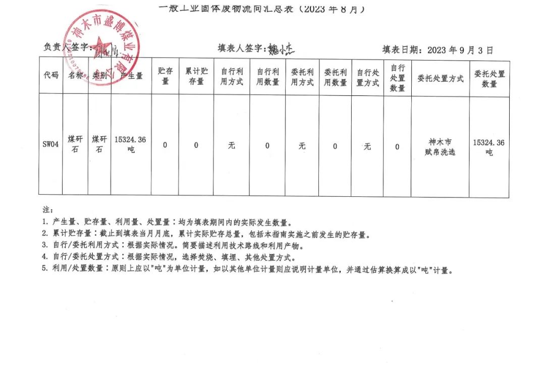 神木市盛博煤业有限公司2023年8月一般固体废物统计报表