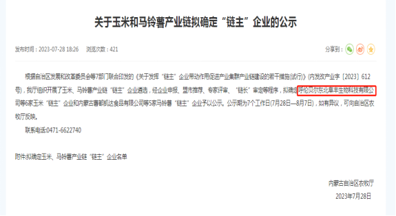 近日,内蒙古自治区农牧厅发布了“关于玉米和马铃薯产业链拟确定链主企业的公示”,东北公司经过申报、盟市推荐、专家评审后被认定为玉米产业链“链主”企业。