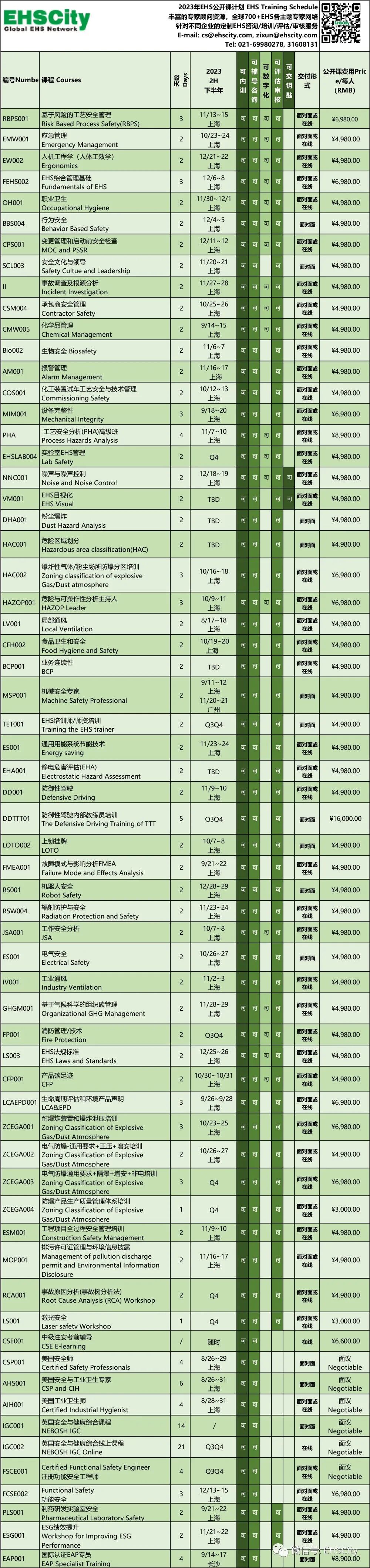 费用为6980元人民币/人(仅包含培训与午餐费用,其他交通住宿晚餐自理)报名联系cs@ehscity.com或021-69980278