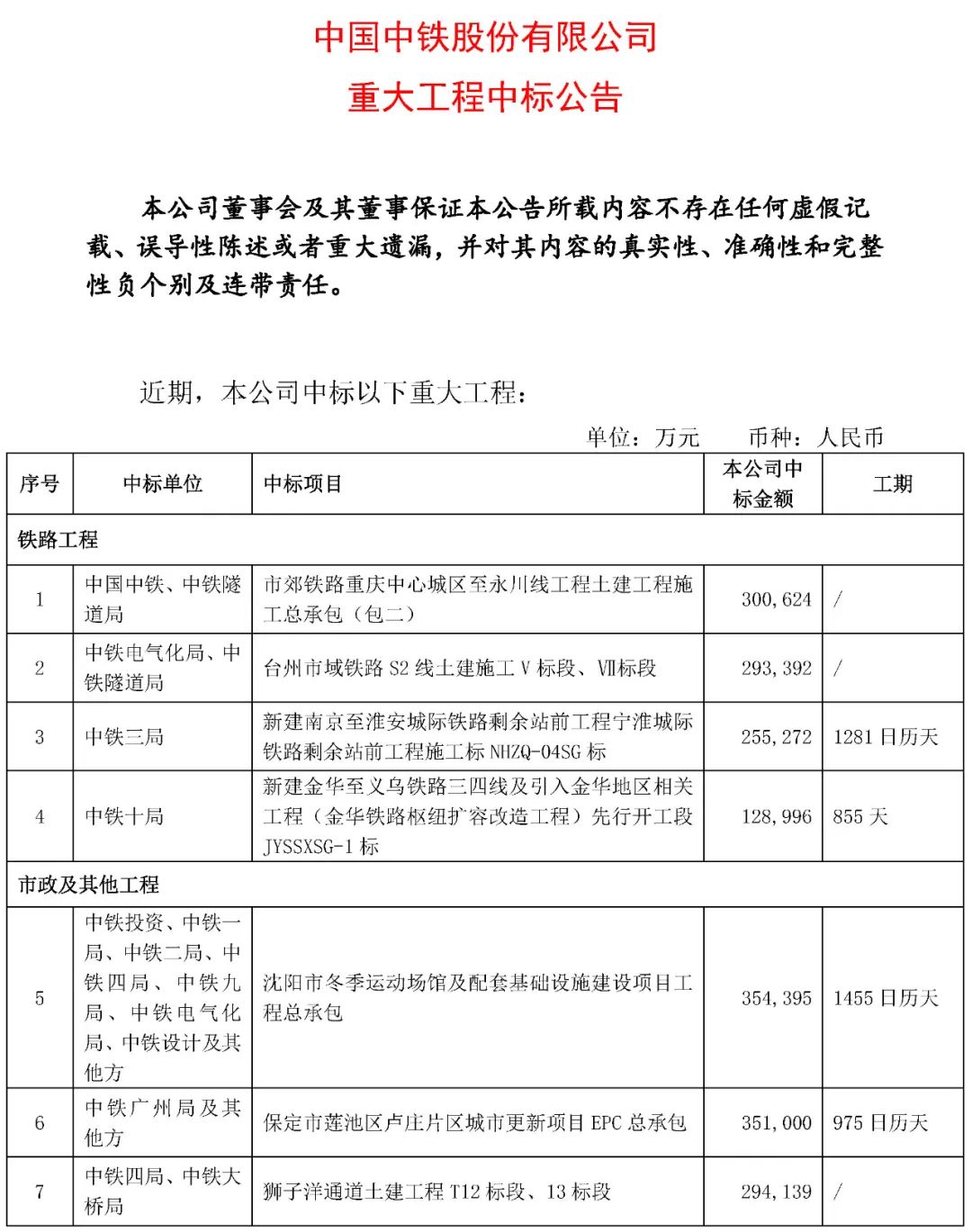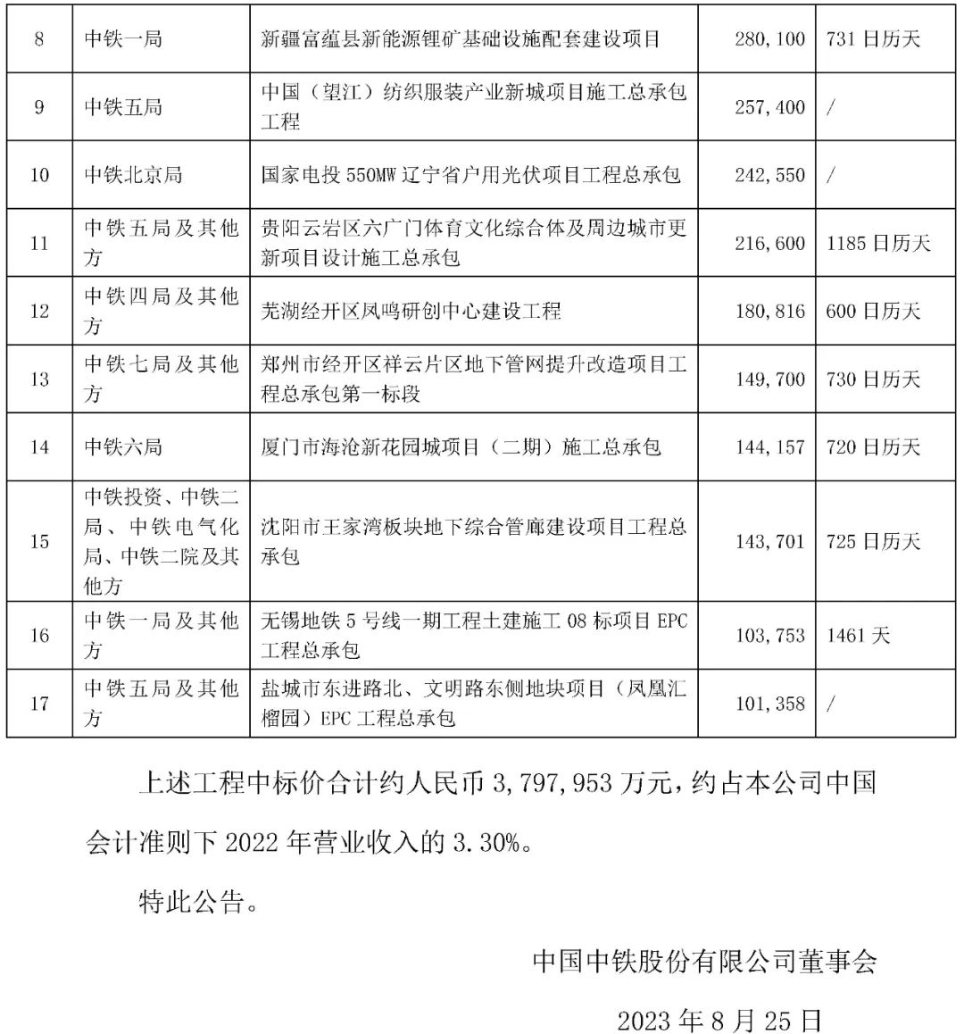 8月25日,中国中铁发布379亿重大项目公告,约占本公司中国会计准则下2022年营业收入的3.3%。其中铁路项目中标金额97.7亿、市政及其他项目中标金额281.3亿。
