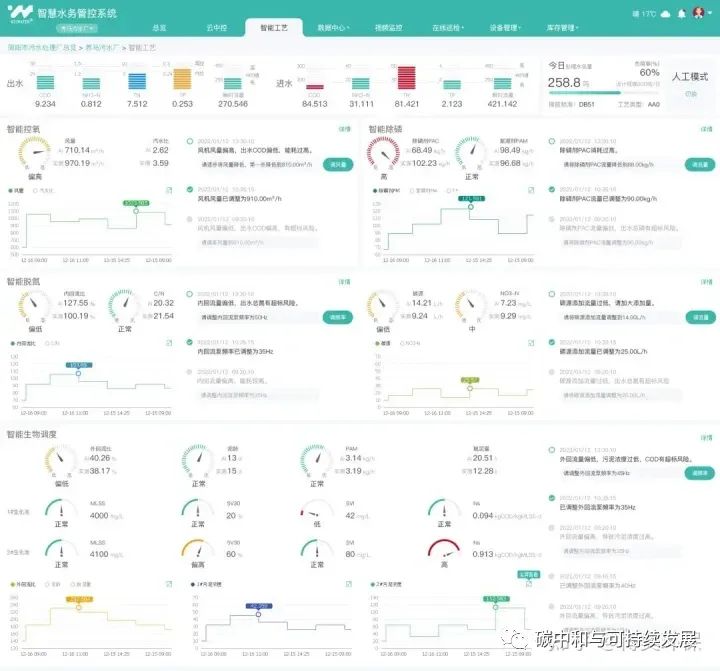 依托于信息技术发展,现代污水处理厂可使用精细传感器与控制设备对水务信息进行采集、传输、存储、处理和服务,提升污水处理效率与效能,亦可实现对污水控制过程的全面监测、科学决策、自动控制并及时响应,实现污水处理厂人工智能化。最终达到优化污水处理厂运营管理、实现精准曝气与回流控制,科学投加各类药剂,节约运行能耗与电力消耗,减少间接间接碳排放量,助力碳中和目标实现。
