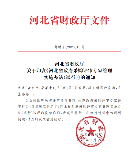 另外,河北省财政厅日前印发《河北省政府采购评审专家管理实施办法(试行)》(冀财采〔2023〕13号),自2023年9月1日起施行。