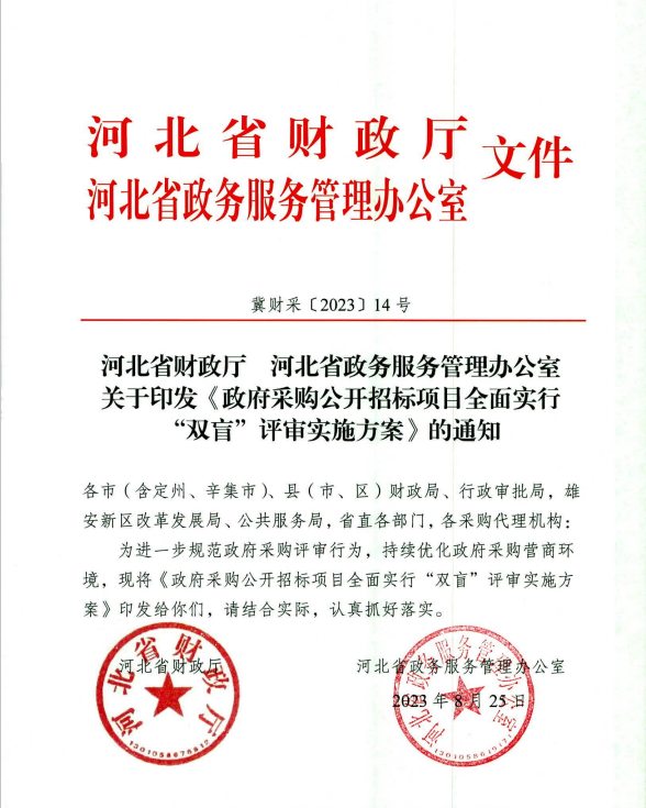 《实施方案》明确工作目标:针对政府投资的依法必须招标的工程建设项目推广招标投标“双盲”评审,营造公平公正、规范高效、阳光透明的招标投标市场环境,助力加快建设经济强省、美丽河北。
