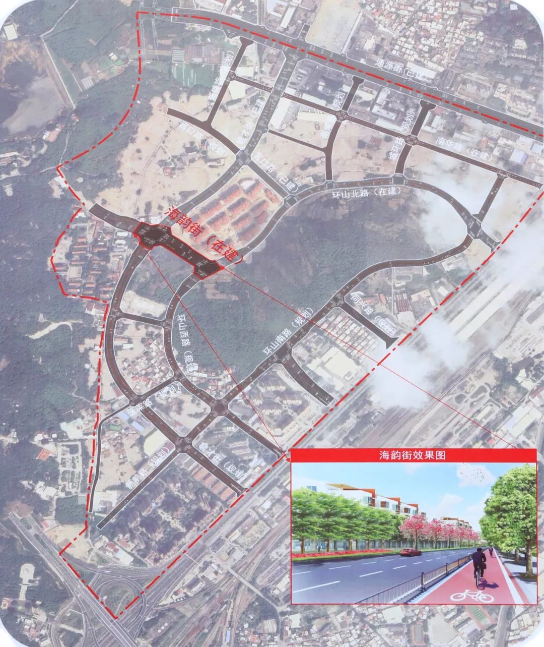 片区规划建设17条道路,毓才街、通源街等主干道已率先建成通车,海韵街目前已开工,另规划有占地约477亩的南埔山公园。