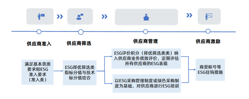 企业供应链ESG管理流程通常可以分为供应商准入、供应商筛选、供应商管理和供应商激励4个环节。在供应商准入环节,企业将ESG风险筛查和基本资质调查相结合进行供应商准入筛选。在供应商筛选环节,企业就择优筛选类指标要求评估部分或所有满足准入条件的供应商ESG表现,并结合技术标得分进行供应商筛选。在供应商管理环节,企业将ESG择优筛选类类评分纳入供应商业务绩效评价,定期评估所有供应商的ESG表现,引导供应商提升ESG表现。此外,企业以ESG采购管理制度或绿色采购制度为基础,对供应商进行ESG培训,推动供应商ESG能力建设。在供应商激励环节,对ESG表现领先的供应商,企业可以设置商誉称号等ESG挂钩措施。