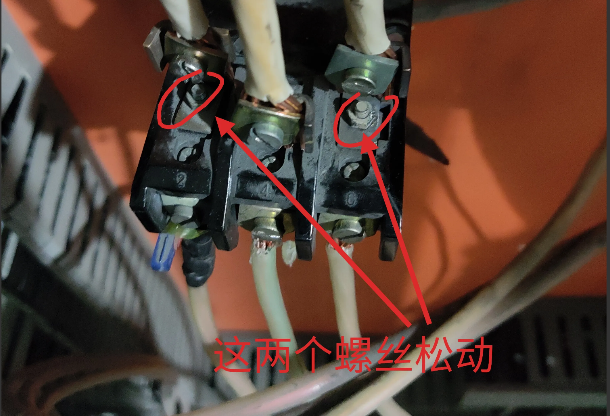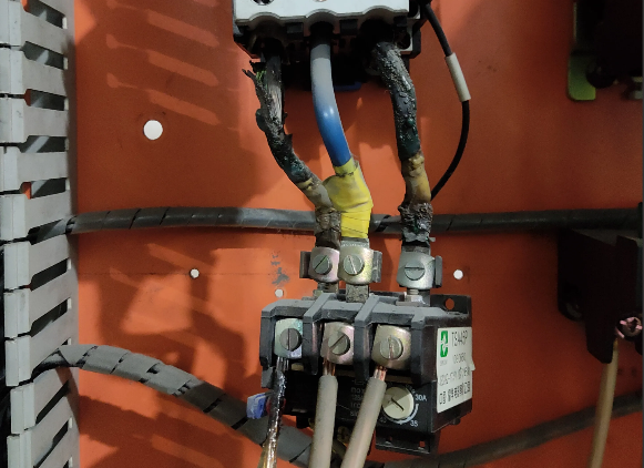 检查接触器出线端电缆压接螺丝,A相C相稍有松动,拆下烧焦的电缆,发现热继电器进线端子固定螺丝也出现了松动的情况。