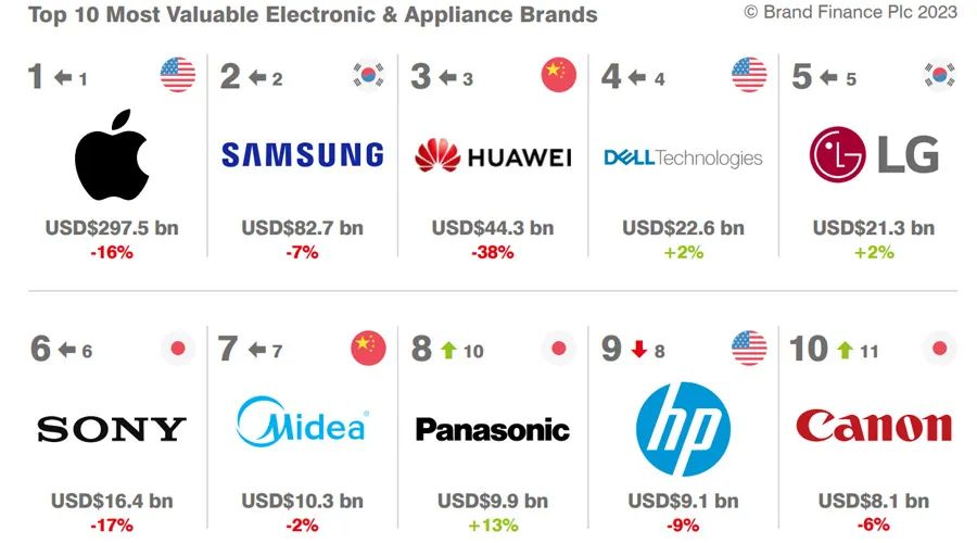 英国品牌评估机构“品牌金融”(Brand Finance)发布2023“全球电子家电品牌价值50强”排行榜(Electronics & Appliances 50 2023),苹果、三星、华为蝉联前三位。