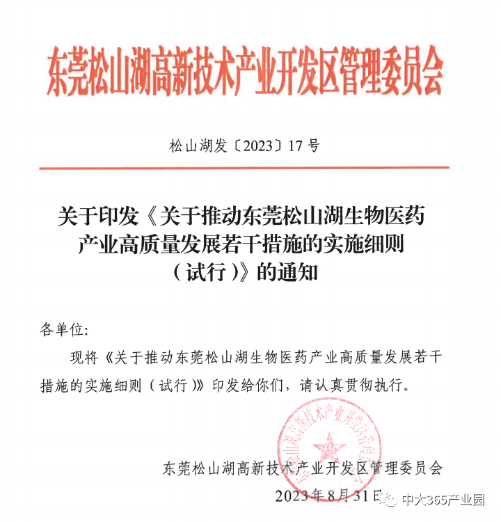 近日(8月31日)《关于推动东莞松山湖生物医药产业高质量发展若干措施的实施细则(试行)》发布