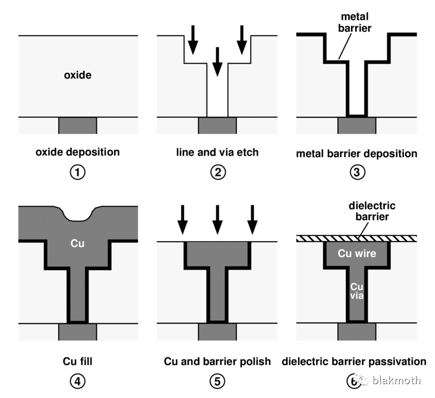 当然铜互连技术不仅仅是一个镶嵌技术的想法。它还包括大量的相关技术的发展和成熟。应该采取什么样的铜沉积技术,溅射是最常见的,但是形成的柱状微晶结构不如电镀的大尺寸颗粒更能抵抗电迁移(铜导线也存在电迁移现象,当然比铝要好得多)。铜本身不方便有意的工艺刻蚀,但是又不耐无意的腐蚀,因为缺乏像铝一样的自然致密氧化膜。另外,铜原子在介质中扩散很快,必须开发防扩散的薄膜。还有铜元素本身对CMOS来说是和金类似的所谓“少子杀手”,是IC制造业谈虎色变的污染源。历史上曾经引发惨重的损失,最后发现是工厂进水管铜材的抗腐蚀层破损造成铜材暴露污染了流过的水。当然既然要发展铜互连技术,早晚就要面对这个问题,摸索出控制铜污染的有效方法。但是这是要付出巨大代价的。