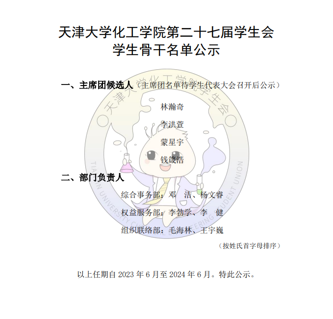公示 | 天津大学化工学院学生会第二十七届学生骨干名单