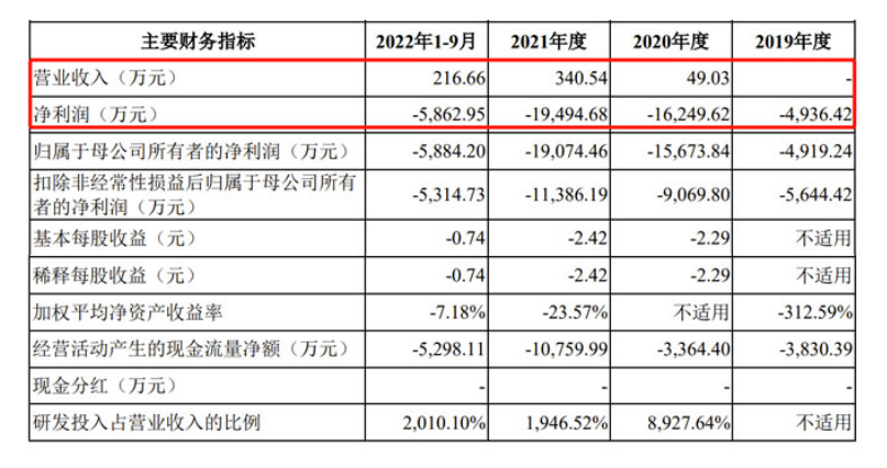 2019年-2021年以及2022年前三季度,捍宇医疗分别确认收入0元、49.03万元、340.54万元及216.66万元,对应实现归母净利润分别约为-4919.24万元、-1.57亿元、-1.91亿元、-5884.2万元;三年零九个月累计亏损4.56亿元。