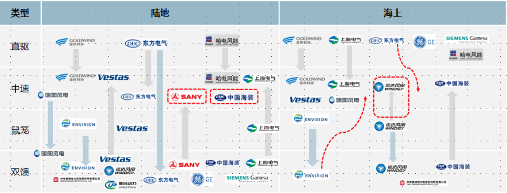 陆地逐步集中在中速和双馈领域,海上则比较明显向中速路线集中。