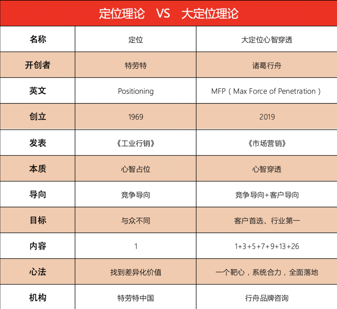 第一个,是名称的区别,定位理论,英文是positioning,大定位理论的全称是大定位心智穿透。大定位英文角度来讲,称为:max force of penetration,简称MFP。MFP,它直译成中文就是:最大的力量。什么力量?是一种渗透性力量。大定位是一种心智渗透的力量,所以名称意义上,或者是核心意义上是有本质区别。开创者,不用说特劳特先生是在上世纪,一九六九年的时候,开创的理论。行舟大定位理论,是我在2018建立的理论,整整比定位理论,时间上正好相差了50年左右。定位理论的发表,在《工业行销》这本杂志上;行舟创立大定位理论,发表在《市场营销》杂志上。本质上:定位就是心智占位,它是一种竞争导向。基于客户的需求,以及竞争对手的差异化形成,建立我们自身的一个差异化。大定位理论前提还是先占据心智,然后是怎么更好地形成一种合力(战略层、视觉层、营销层),最终穿透心智。大定位理论是竞争导向,同时也是客户导向。定位理论,英文就是different,就是与众不同。 但是行舟大定位光与众不同,还不够,它更多的是怎么完成客户在进行品类选择时候的首选,我们称之为价值首选。定位就是一个原点,简称1。但大定位是1、3、5、7、9、13、26。内容丰富性要比定位理论丰富很多,是围绕人的整个6大触感展开(佛教讲六识)。大定位心法就是:一个靶心、系统合力、全面落地。怎么讲?一个靶心就是核心定位1,这是1个原点,首先把这个原点找到。然后呢,基于合力,营销力必须是围绕一个原点展开,也可以称之为同心力。而且是360度,3大层面(战略层、视觉层、营销层)。 全面落地,就是要求是全方位的触点。客户通过各种触点感知品牌。所以,大定位心法:一个核心原点,一个靶心,系统合力,全面落地,让客户全面感知接触到。