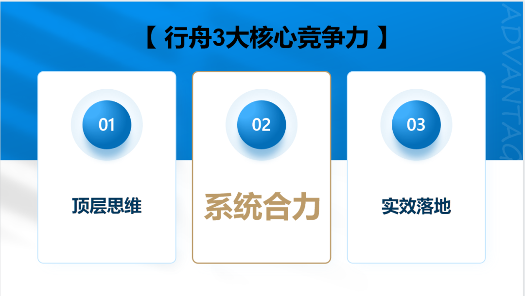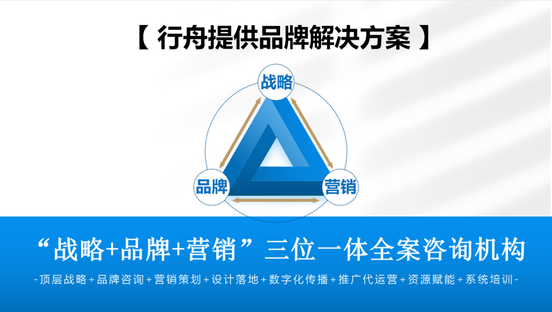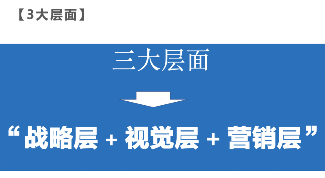 我们行舟把它概括为战略层,视觉层和营销层。如果再展开一点的话,战略层又分成三个层面:有顶层战略,品牌战略,还有产品战略,这三个层面我们统称为战略层。视觉层,视觉里面有什么呢?有超级性的视觉,还有核心视觉。核心视觉,我们常规看到的,一个品牌标志logo,还有它的VI等等。超级视觉就不太一样啊,类似超级符号,超级IP,超级色彩等等。超级视觉在同行中能够形成较大差异化,更能够被客户发现,形成突破。第三个层面是营销层,又可以把它分为两类:一类是整个营销的这个创意和推广方向,我们以这个为导向,形成品牌背书势能,品牌创意;还有一块,就是能够让客户全方位进行营销落地触点接触,因为营销一定是在全面性上形成触点化,才能够更好地让客户感知到。创意,背书势能被感知,但是还需要让客户无处不在地被感知,这就是营销触点。其实3大层面,总结就是战略层,视觉层和营销层,形成七个维度:顶层战略,品牌战略,产品战略,核心视觉,超级视觉,营销推广以及触点落地。