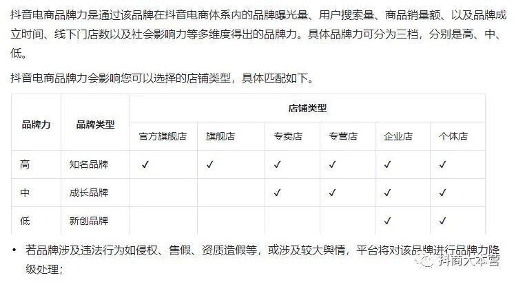 抖音电商品牌力会影响您可以选择的店铺类型,具体匹配如下。