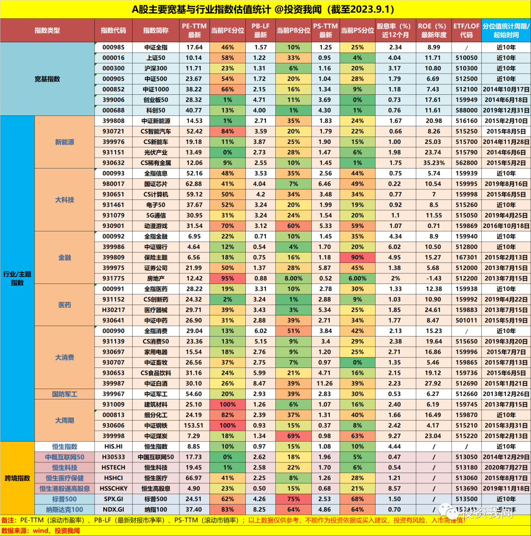 A股主要宽基和行业指数估值统计-23.9.1