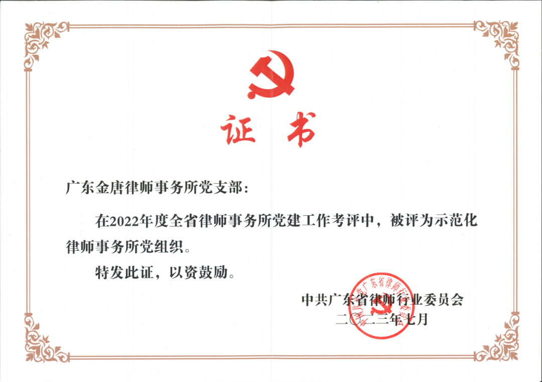 一张证书,一份荣誉。广东金唐律师事务所党支部,在2022年度广东全省律师事务所党建工作考评中,被评为“示范化律师事务所党组织”。2023年8月31日,金唐律所党支部正式收到中共广东省律师行业委员会颁发的荣誉证书,备受鼓舞。一直以来,金唐律所党支部坚持以习近平新时代中国特色社会主义思想为指导,充分发挥党建引领作用,坚决落实“党建促所建,所建促发展”的核心理念不动摇,致力于党建工作和业务工作同频共振、深度融合、共同发展。“广东省示范化律师事务所党组织”的荣誉,犹如一盏明灯,既照亮了以往金唐律所在党建工作的点滴付出,又指明了我们金唐在“党建+所建”工作持续进步的道路。金唐律所党支部将不忘初心、牢记使命,珍惜荣誉、砥砺前行,持续深入学习贯彻党的二十大精神,积极响应和落实司法部党组对广大律师提出的“五点希望”,主动对标对点党建考评工作细则,查漏补缺,推动律所党建工作再上新台阶。党建专栏丨金唐党支部被评为“2022年度全省律师行业示范化律师事务所党组织”