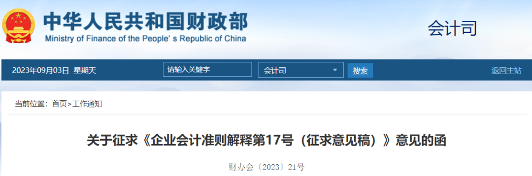为解决企业会计准则执行中出现的问题,并保持我国企业会计准则与国际财务报告准则的持续趋同,我们起草了《企业会计准则解释第17号(征求意见稿)》。现印发你们,请组织征求意见,并于2023年9月24日前将意见反馈至财政部会计司,反馈意见材料中请注明联系人及其联系方式。