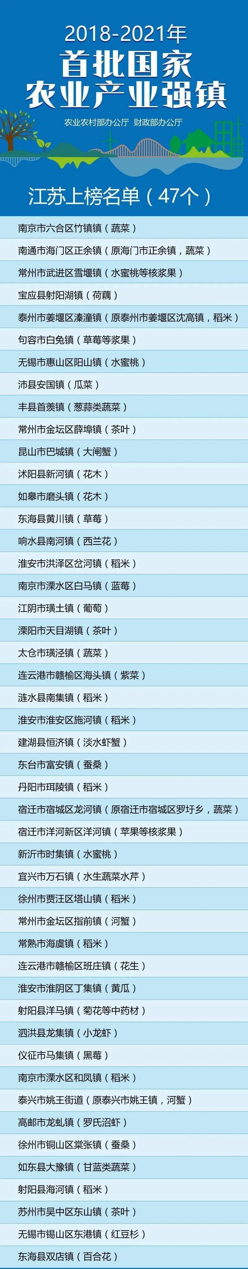 近日,农业农村部办公厅、财政部办公厅发布《关于公布首批国家农业产业强镇名单的通知》(农办产〔2023〕7号),经绩效考核、认定申请、省级推荐和材料审核等程序,认定770个国家农业产业强镇,江苏省共有47个镇上榜。