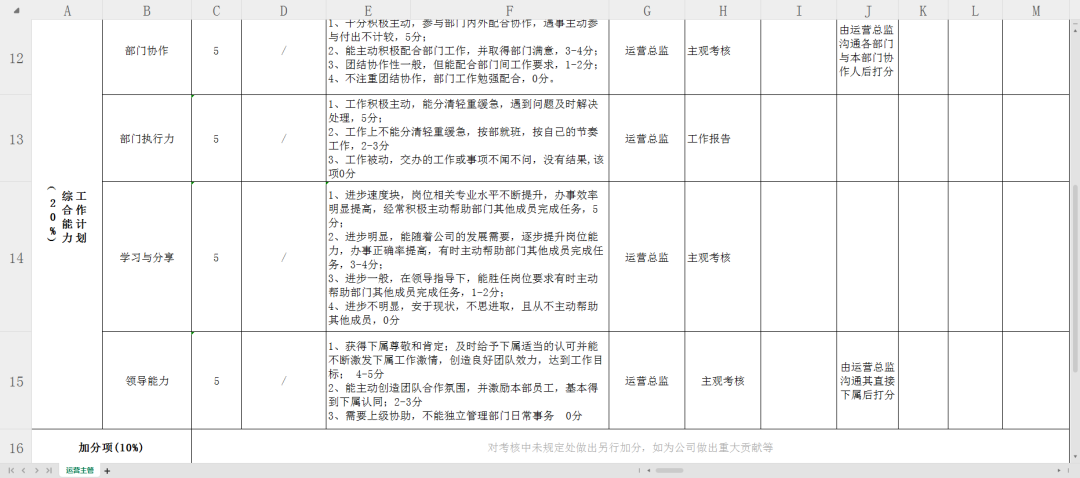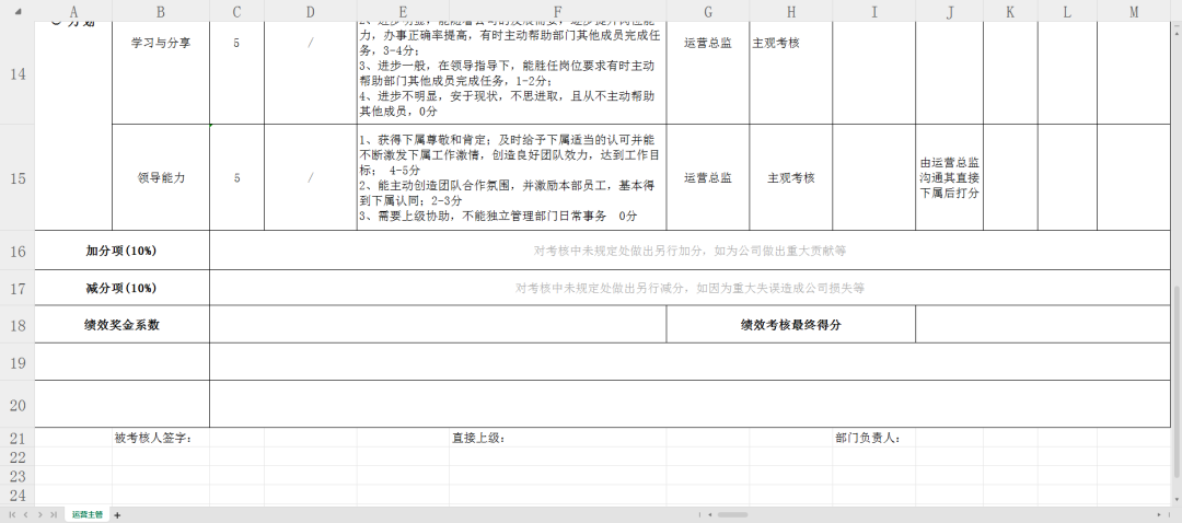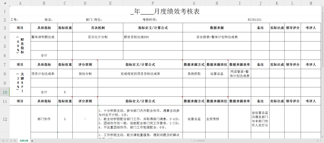 亚马逊运营主管KPI绩效考核表