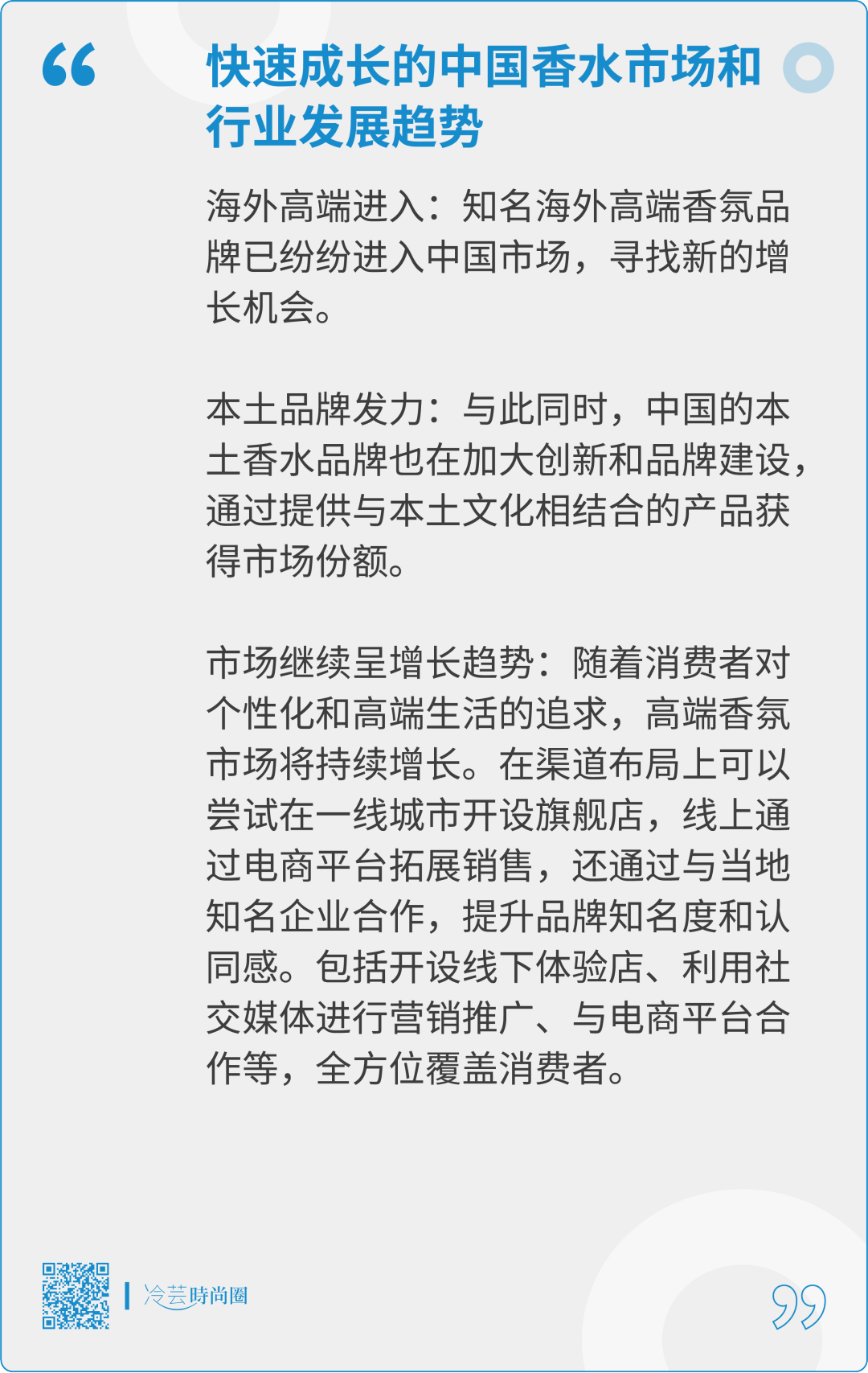 综上所述,中国香水市场增长迅猛,本土品牌正处在重要的战略机遇期。只要立足中华文化底蕴,拥抱数字化赋能,顺应个性化消费需求,以差异化定位谋求品牌突破,中国原创香水品牌还具有极大的成长空间。