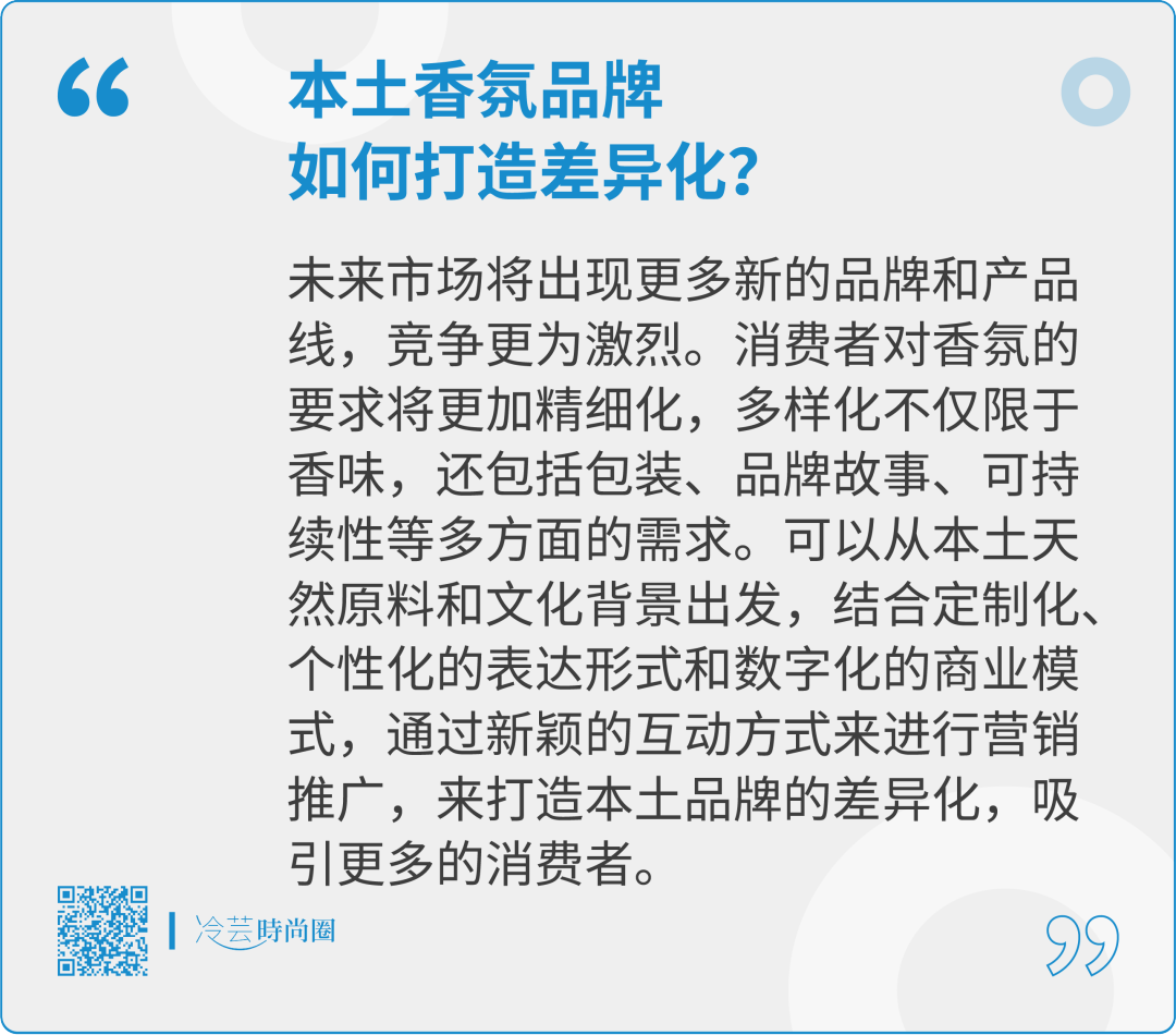 未来市场将出现更多新的品牌和产品线,竞争更为激烈。消费者对香氛的要求将更加精细化,多样化不仅限于香味,还包括包装、品牌故事、可持续性等多方面的需求。可以从本土天然原料和文化背景出发,结合定制化、个性化的表达形式和数字化的商业模式,通过新颖的互动方式来进行营销推广,来打造本土品牌的差异化,吸引更多的消费者。
