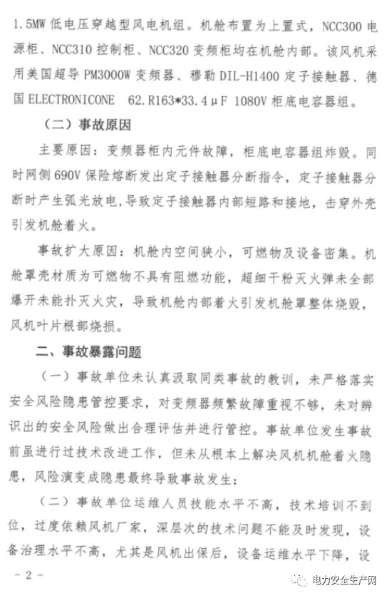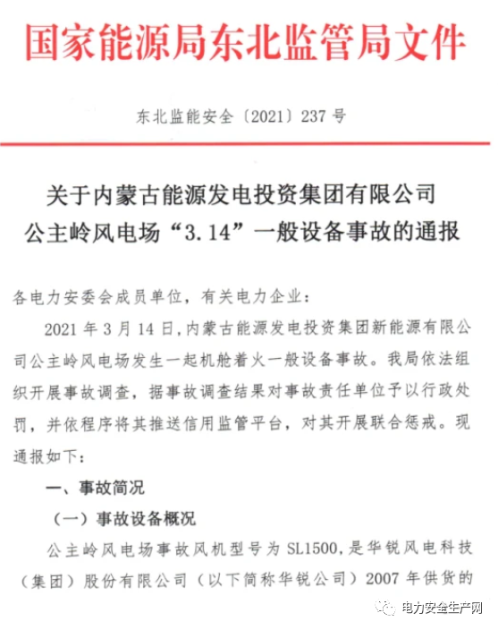 国家能源局对2021年3月电力事故进行了通报,此次通报中包括一例风电设备起火事故(该起事故此前报道请看:事故!变频器故障引燃风机机舱!公主岭风机烧毁《事故报告》出炉!)