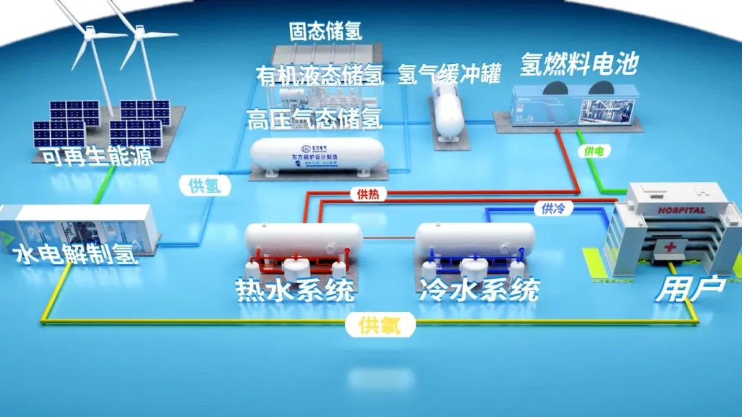 东方氢能继助力三峡集团首次实现氢燃料电池热电联供产品在高寒地区及“源网荷储”场景批量应用和助力南方电网建成国内首个固态储供氢耦合氢燃料电池发电示范项目之后,此次全新开发出了功能更齐全、性能更优异的国内首套五联综合能源系统,超高度集成了电解水制氢、高密度储供氢、氢燃料电池热电联供系统等多项核心装备,涵盖绿电纯水制氢、制氧、储氢、供电、传热、供冷、供热,是氢能界的“全能冠军”。还具备一键启停和“黑启动”安全运行能力,综合效率超过95%,能源供给可灵活调节,轻松实现不同类型能源的按需输出,可广泛应用于储能调峰、应急电源、备用电源和零碳园区等综合用能场景,为打造零碳供能体系,大规模绿色氢能综合利用新模式的示范奠定了技术基础。